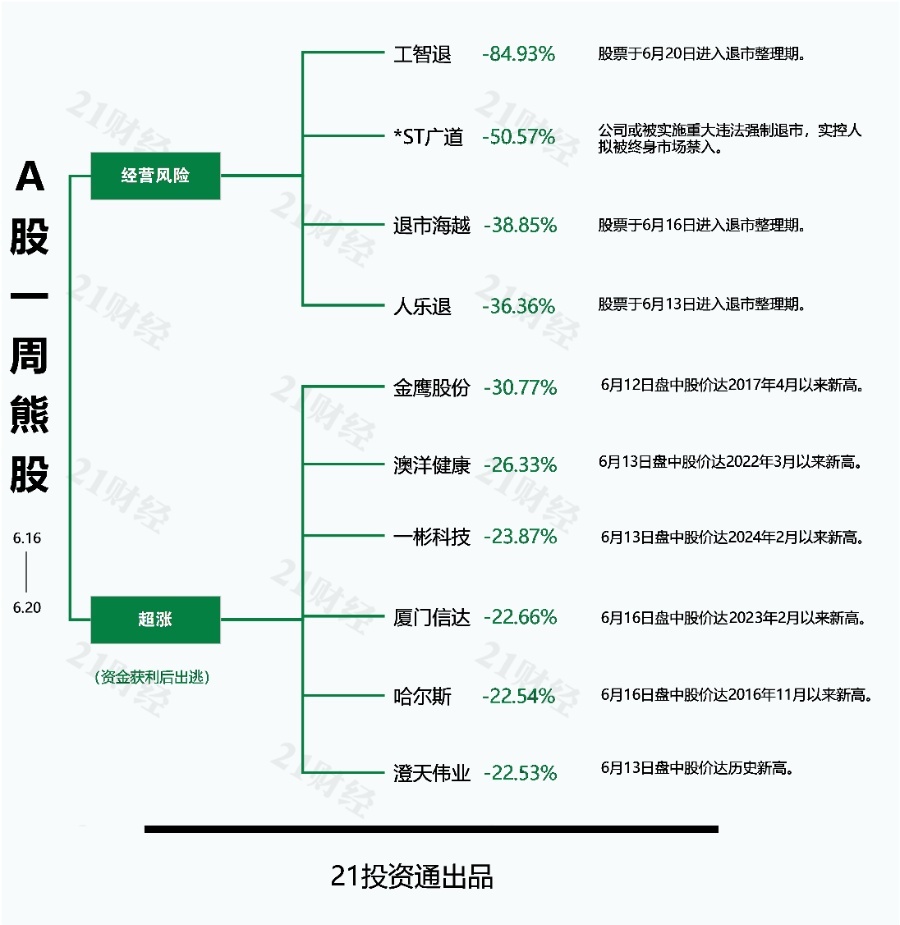 本期十大熊股中,工智退(000584.SZ)以84.93%的跌幅成为本期的最熊股。*ST广道(839680.BJ)、退市海越(600387.SH)、人乐退(002336.SZ)、金鹰股份(600232.SH)等股的周跌幅均在22%以上。